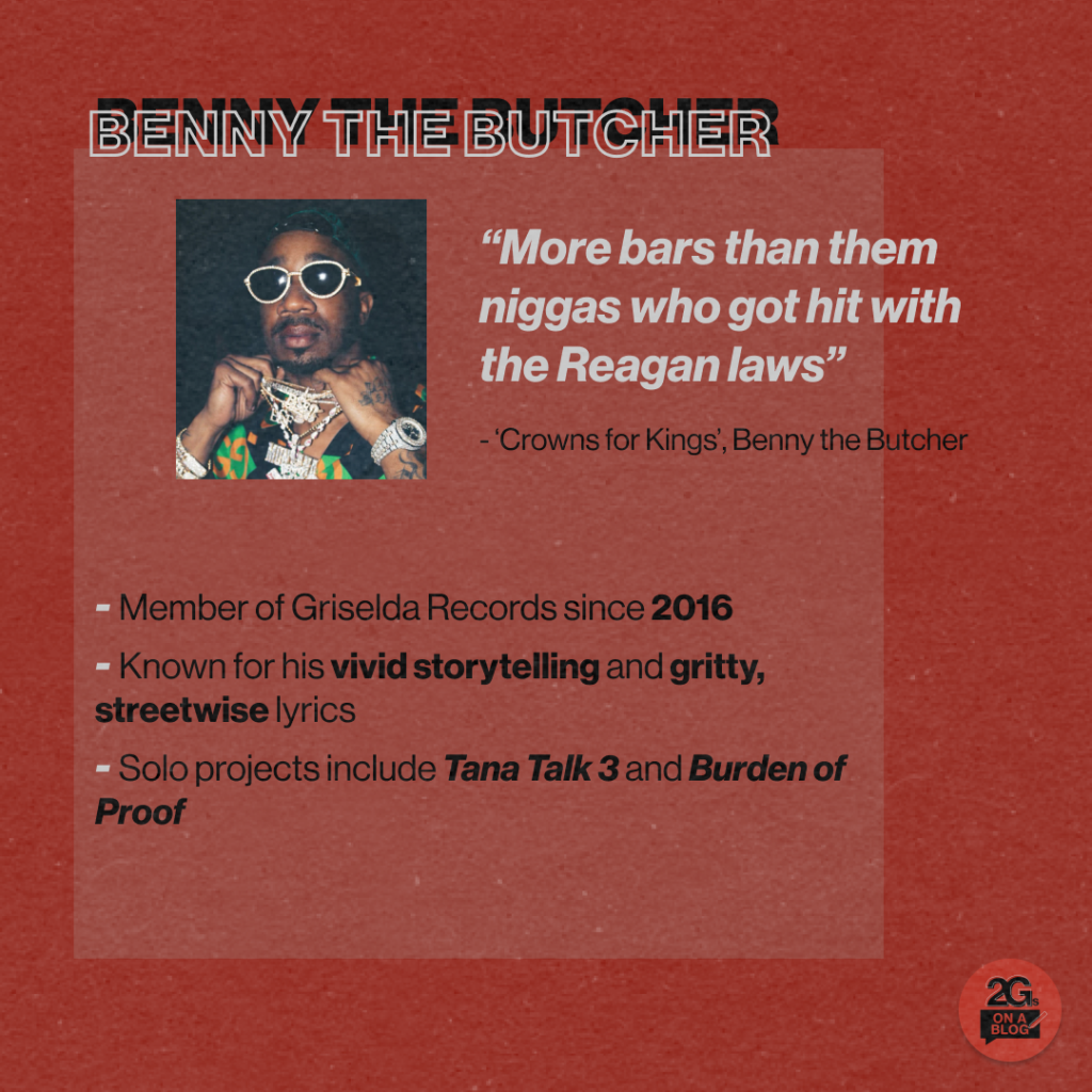 In Benny, the trio seems to have found its superstar, as he continues to rise to mainstream prominence. As much as I love Westside’s adlibs, Benny may just have the pick of the bunch with his nametag, “the Butcher coming, nigga!” Being the most marketable arm of the trio is what Benny specifically brings to the group, and explains his mainstream success in recent times. As I said earlier, rap isn’t always purely about who has the best bars around. I would be lying if I said Burden of Proof was my favourite project to come from one of the Griselda boys, but it’s quite easy to see why it’s done so well commercially. The features alone are largely big names who immediately take the project away from the purely Wu-Tang sound, into a more recognised listening experience for many hip-hop fans today. We’re all required to code-switch to some extent when we leave the comfort of our own homes and communities and enter our day jobs: Benny just seems to know exactly how to mix his own language with one which a wider audience will relate to and engage with.